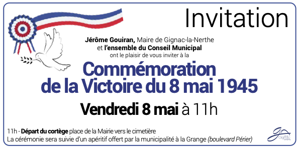 Rendez-vous vendredi 8 mai à 11h, départ du cortège depuis la place de la Mairie vers le vieux cimetière, suivi d’un apéritif à la Grange du centre-ville.