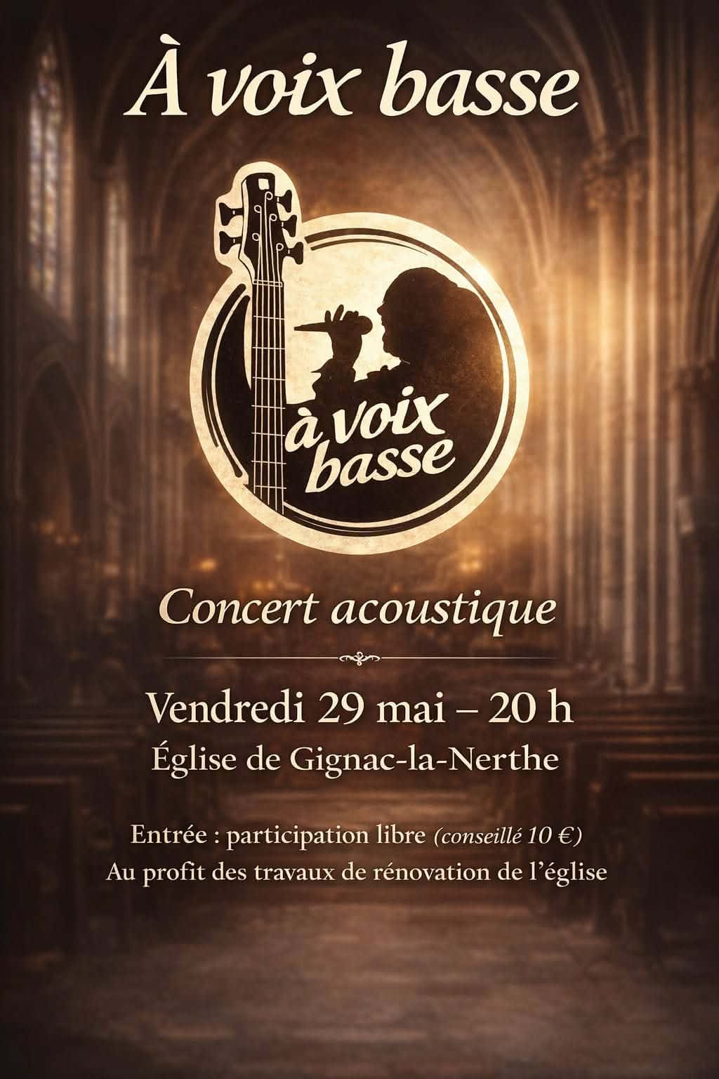 Un concert acoustique « À voix basse » se tiendra le vendredi 29 mai à 20h à l’église de Gignac-la-Nerthe.