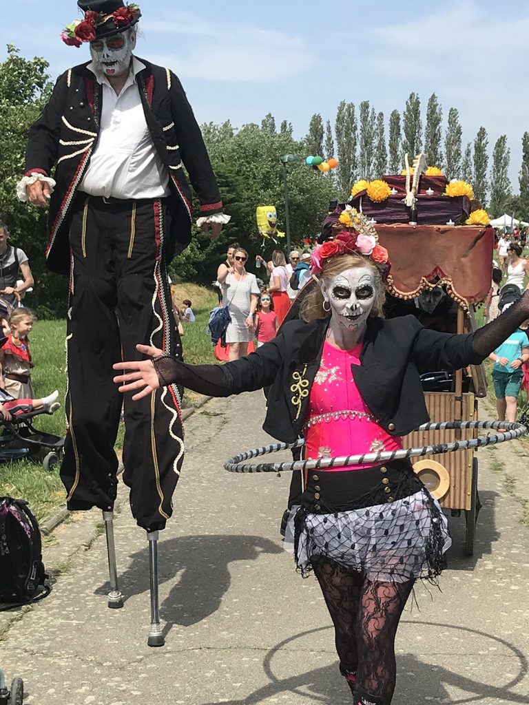 Tout au long de l’après-midi, la compagnie Estock Fish déambulera dans la cour de l’école : Les calaveras, ces joyeux drilles de revenants, sont en permission du pays des morts. Ils sont de retour pour une journée, le temps de revoir leurs proches et le monde des vivants. Le temps de festoyer, de s’amuser, boire et manger, rigoler et danser, se divertir et aimer, avant que le couchant ne les entraîne à nouveau dans leur tombeau… Cinq artistes, échassiers, acrobates, jongleurs, déambulent et s’arrêtent pour présenter des scénettes, ou le drôle côtoie l’effrayant. Échasses à rebond, jonglage aux haches, grand bi…