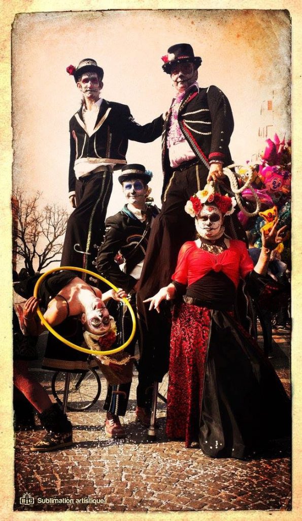 Tout au long de l’après-midi, la compagnie Estock Fish déambulera dans la cour de l’école : Les calaveras, ces joyeux drilles de revenants, sont en permission du pays des morts. Ils sont de retour pour une journée, le temps de revoir leurs proches et le monde des vivants. Le temps de festoyer, de s’amuser, boire et manger, rigoler et danser, se divertir et aimer, avant que le couchant ne les entraîne à nouveau dans leur tombeau… Cinq artistes, échassiers, acrobates, jongleurs, déambulent et s’arrêtent pour présenter des scénettes, ou le drôle côtoie l’effrayant. Échasses à rebond, jonglage aux haches, grand bi…